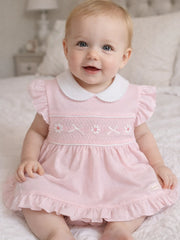 This beautiful summer dress from Amore comes in light pink and features frilled trim at the shoulders and along the hem. It also has a white collar, and a smocked panel on the chest with bow and flower embroidery.