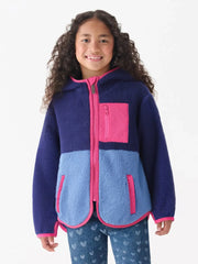 An ideal top layer for those chilly autumn days, this cosy sherpa jacket from Hatley features a colourblock design in navy, pink, and blue, with contrasting bright pink trim.