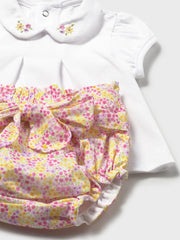 This charming baby girl's outfit from Mayoral includes a white short sleeve top, a button up cardigan, and a pair of printed bloomers. The sunny yellow cardigan has frilled trim at the hem and cuffs, while the crisp white top has a rounded collar embroidered with dainty flowers. The bloomers have an all over floral ditsy print in shades of yellow and pink, and is finished with a large bow on the front.