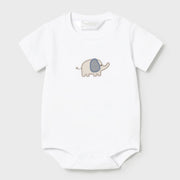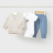 This newborn boy's tracksuit by Mayoral includes powder blue track bottoms, a charming white bodysuit with a cute elephant appliqué, and a beige zip up top patterned with adorable elephants.