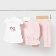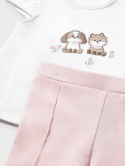 Great for family days out or cosy days at home, this beautiful baby girl's set from Mayoral includes a pair of soft pink leggings, and a white short sleeve t-shirt with an adorable puppy and kitten embroidered on the front. The outfit is completed with a matching pink button up top.
