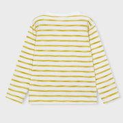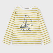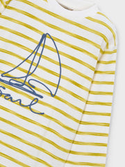 Mayoral boy's long sleeve crewneck t-shirt, in white with a pattern of yellow painted stripes, it also features an embroidered blue sailboat on the front.
