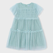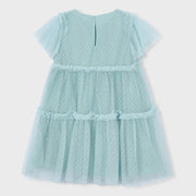 Girl's pale green summer dress from Mayoral. Crafted from layers of lightweight tulle with plumeti detailing, this elegant dress also has a tiered design with a shirred bodice and frilled seams at the shoulders.