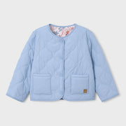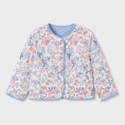 Girl's lightweight reversible jacket from Mayoral. Great for the unpredictable spring weather, this versatile jacket has a sky blue side with curved pattern stitching, and a white side with an all over floral print in shades of red and blue.