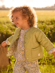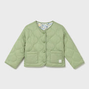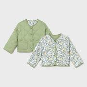 Baby girl's lightweight reversible jacket from Mayoral. Great for the unpredictable spring weather, this versatile jacket has a pale pistachio green side with curved pattern stitching, and a white side with an all over floral print in shades of yellow, green, and blue.