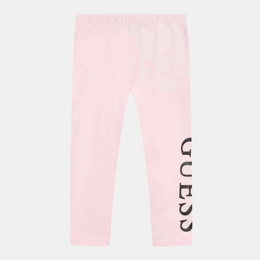 Guess girl's full length leggings, in pale pink with a glitter logo on one leg. Made from a stretchy cotton blend. Code: k3yb01