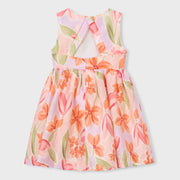 Great for parties and special summer occasions, this beautiful dress by Mayoral has an elegant, sleeveless design with an open back and a gently pleated skirt. It features an all over print of painted flowers in shades of orange, pink, and green, and is finished with a matching printed bow at the waist.