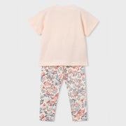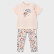 Mayoral girl's two piece summer leggings set, includes a pale peach t-shirt with a pair of cowboy hats printed on the front, and a pair of full length leggings featuring an all over vintage floral pattern in shades of orange and blue.