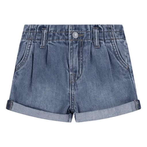 Girl's summer shorts set from Guess, includes a crisp white t-shirt, and a pair pale blue of printed shorts. The t-shirt features a pink embroidere...