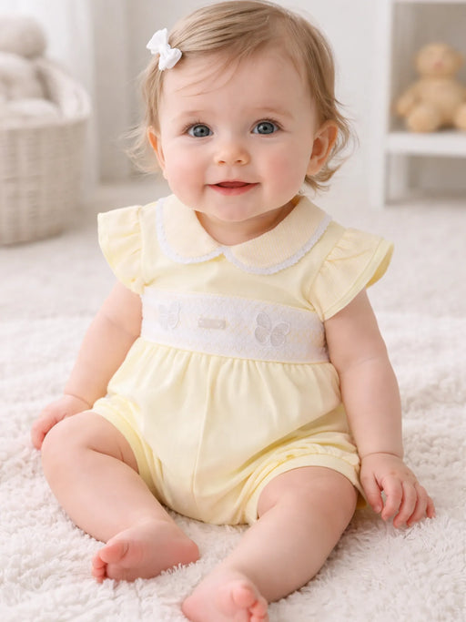 Amore newborn girl's babygrow, in lemon yellow with a small logo badge at the neck, and white smocking across the chest. Code: am0061
