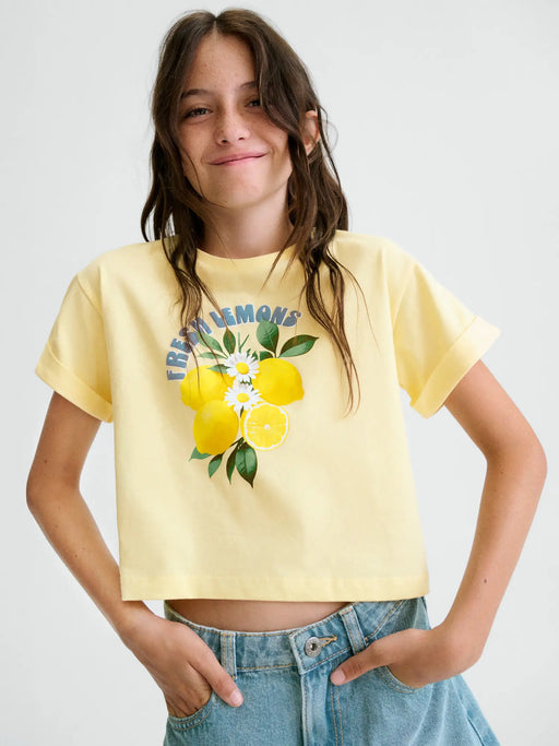 Crafted from 100% cotton, this girl's cropped t-shirt from Mayoral features comes in pale yellow and features a summery lemon print on the front. C...