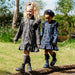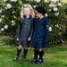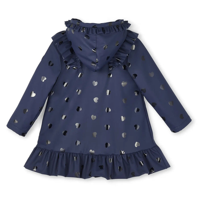 This charming raincoat by A Dee comes in navy blue and features frilled trim at the shoulders, hem, and pockets. It also has frills around the hood, and is dotted with cute shiny hearts.