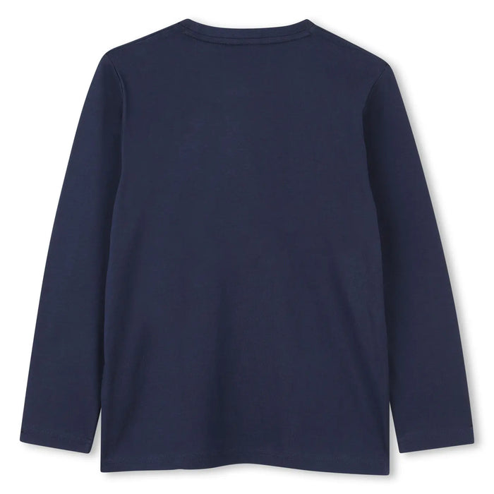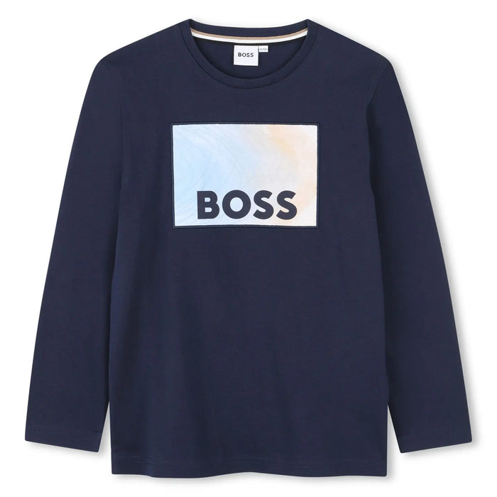 BOSS boy's classic long sleeve crew neck t-shirt, in dark navy blue with a graphic logo design on the chest.