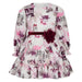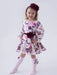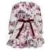Daga girl's long sleeeve dress, in white with a frilled hem and a simple round neckline. It also has an all over fashion themed print in shades of pink and purple, and a burgundy velvet belt about the waist.