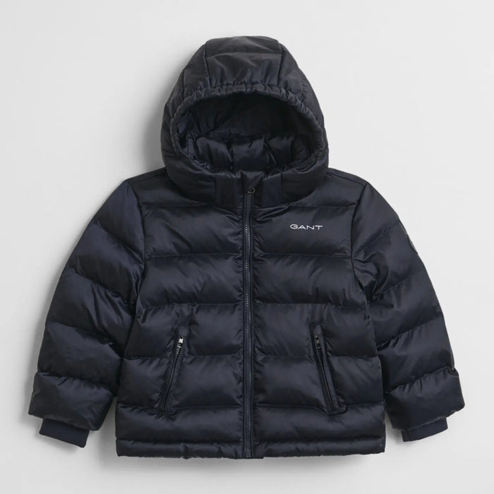 Crafted with a water repellent shell, this padded jacket from GANT is perfect for days spent outdoors. It comes in dark navy blue, and has a silver GANT logo on the chest. It also has zipped front pockets, cuffed sleeves, and a detachable hood.