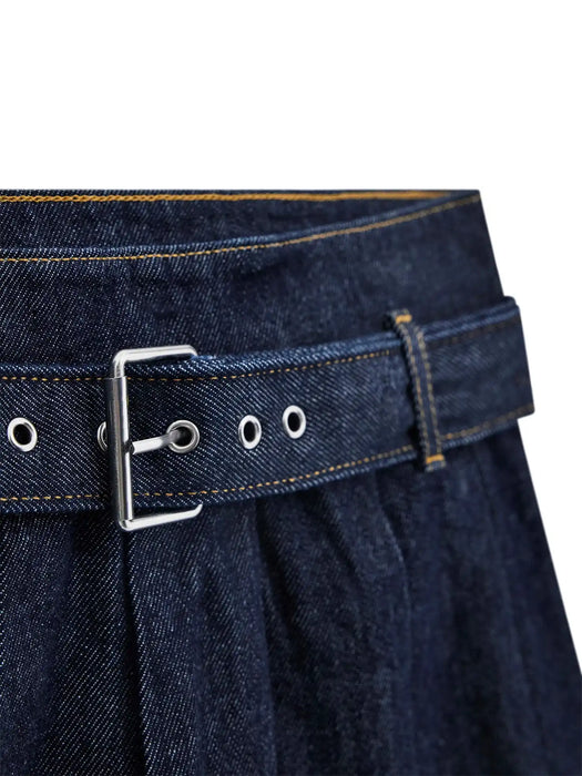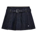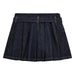Guess girl's pleated skirt, made with a dark wash denim it has a matching denim belt with a silver buckle, and a small silver logo badge at the hem.