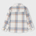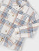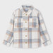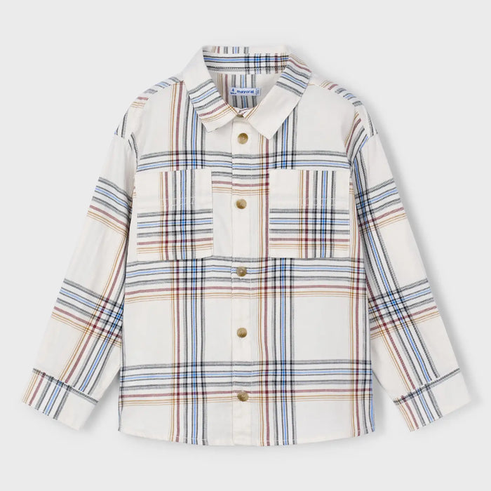 Mayoral boy's cotton shirt, in cream white with a burgundy, blue, orange, and blue check pattern. This shirt also has two chest pockets, and is made from 100% cotton.