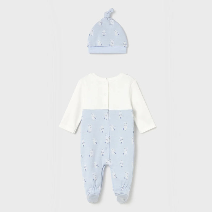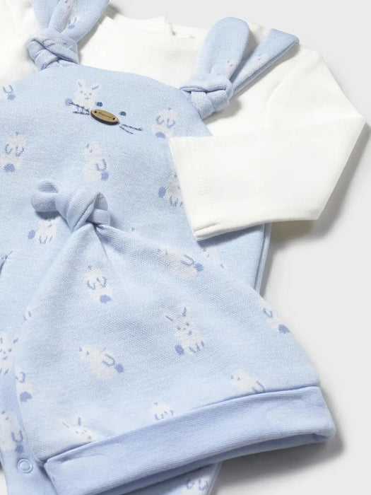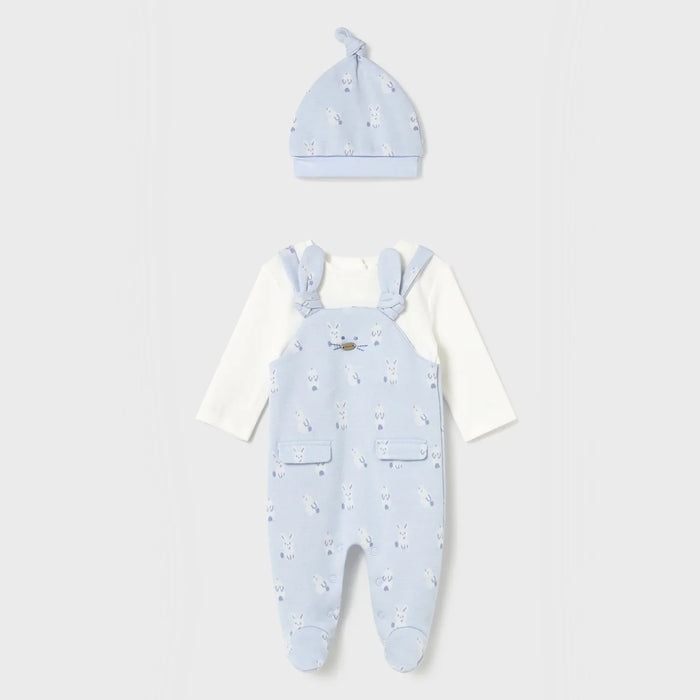 Mayoral boy's dungarees style babygrow, in sky blue with white sleeves and an all over bunny rabbit print.