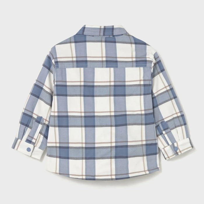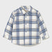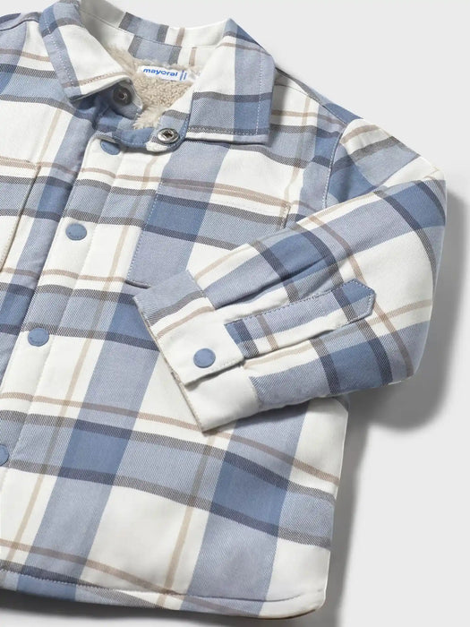 Mayoral baby boy's check overshirt, in white with a pale blue check pattern. It also has a warm fleece inner lining, making it a great choice for chilly autumn weather.