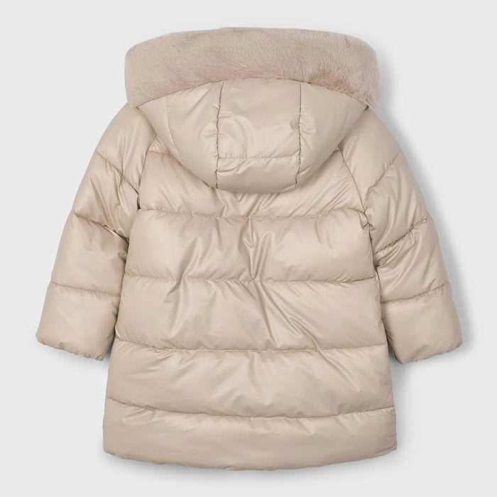 Girl's warm padded coat from Mayoral, in light beige with a silky soft sheen finish. It has a large hood trimmed with faux fur, buttoned front pockets, and warm padding to keep out the cold.