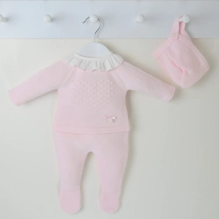 Crafted from beautifully soft knitted yarn in a pretty pastel pink, this elegant set from Pex includes a long sleeve top, matching pink bottoms, and a cute pink bonnet. The top has an elegant fabric ruffle collar and a gorgeous textured heart pattern on the front, along with a dainty bow and pearlised pendant.