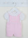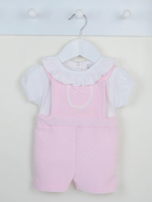These fabulous short summer dungarees, comes in pastel pink and are made with a diamond textured cotton. They have an adorable lace trimmed pocket on the chest that also features a dainty white ribbon bow.