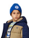 Boy's rib knit beanie hat from Timberland, in blue with a white embroidered tree logo on the front.