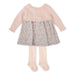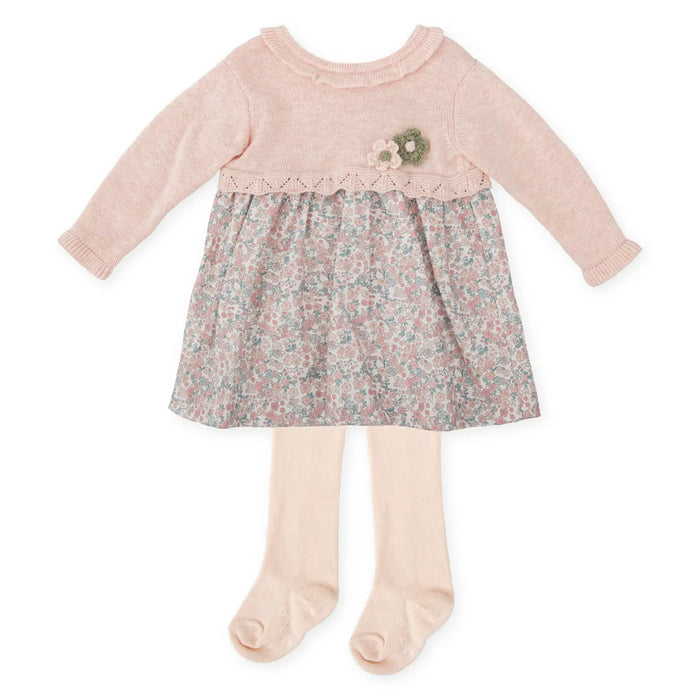 Tutto Piccolo baby girl's long sleeve dress, featuring a pale pink knitted bodice, and a pleated skirt adorned with a pink and green floral pattern. The dress also has two lovely crocheted flowers on the chest, and comes with a pair of matching tights.