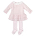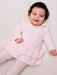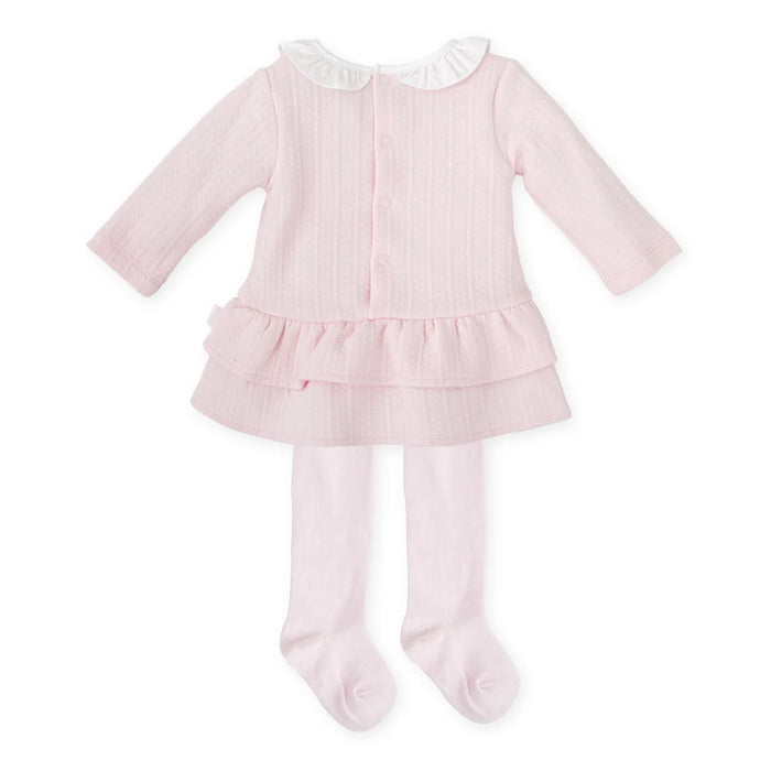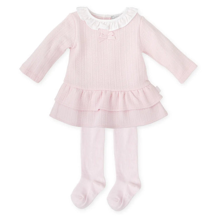 Baby girl's long sleeve dress by Tutto Piccolo. This adorable dress comes in pale pink and features a cable knit textured finish, and a white frilled collar. It also has a small pink bow on the chest, and comes with a pair of matching pink tights.